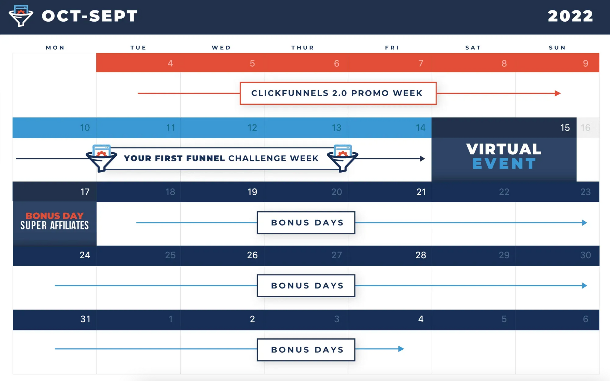 ClickFunnels launched "CF2point0" at Funnel Hacking Live in Orlando, Florida on September 22nd, 2022. Starting on October 4, 2022 Russell Brunson launched ClickFunnels 2.0 with a new 'Challenge Funnel', backpacking on the success of the One Funnel Away Challenge. The new 'Challenge Funnel' is called the 'Your First Funnel' Challenge which leveraged a virtual event and roaster of top the ClickFunnels affiliates.